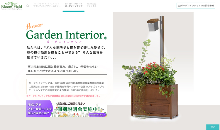2006年、浜名湖花博で「モネの庭」を設計・施工した故玉崎弘志氏を取締役に加え、トータルなガーデニング事業の展開を目的に、 ブルームフィールド事業部を設けました。以来、ベランダや室内という特殊環境を中心としたコンテナガーデニングの 商品開発をはじめ、ガーデンをテーマとした施設のデザイン提案や事業のコンサルティング、さらに今までにない剪定ソフト等、新たなコンテンツの開発を行っています。